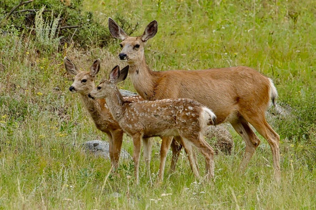 Appropriately, at Deer Mountain, a mule deer doe and twin fawns stood frozen for just a moment. Our cameras had not been up long before she scampered away and into the forest where her babies would be protected.