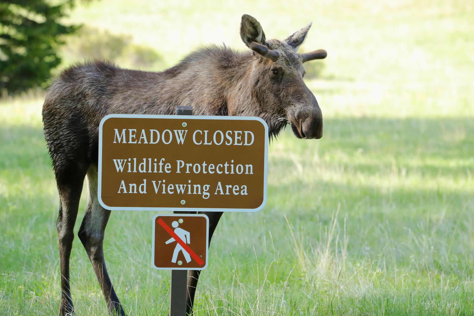 At Sheep Lakes, we watched a young bull until he ran from the lake toward where we stood on the curve. Stopping, he posed as if to remind us it was his land. We captured a picture of him behind a sign that read, “Meadow Closed: Wildlife Protection and Viewing Area.”
