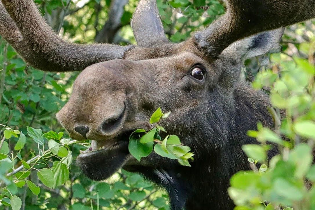 A few days later, we were off together searching for wildlife to photograph. It was a wonderful morning, with animals greeting us at many stops. In Endo Valley, there was a bull moose feeding on the leaves by munching down on the branch, pulling it through his mouth, and shedding the stem of its greens.