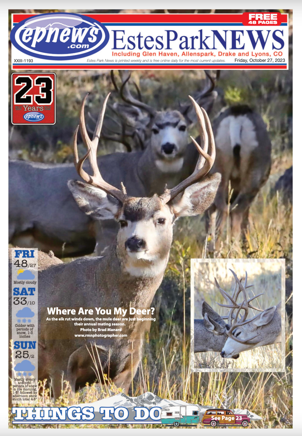 Now in 2024, five years and five mule deer images on the cover of Estes Park News later, I was on one of my daily trips into RMNP. I was sitting in the Hollowell Park turn-a-round, and two days of thick snow had covered the meadow. As I scanned the surroundings, I sensed a slight movement. Then I saw him. A hundred yards away a handsome mule deer buck was moving through the trees, snow kicking up from his feet with each step.
