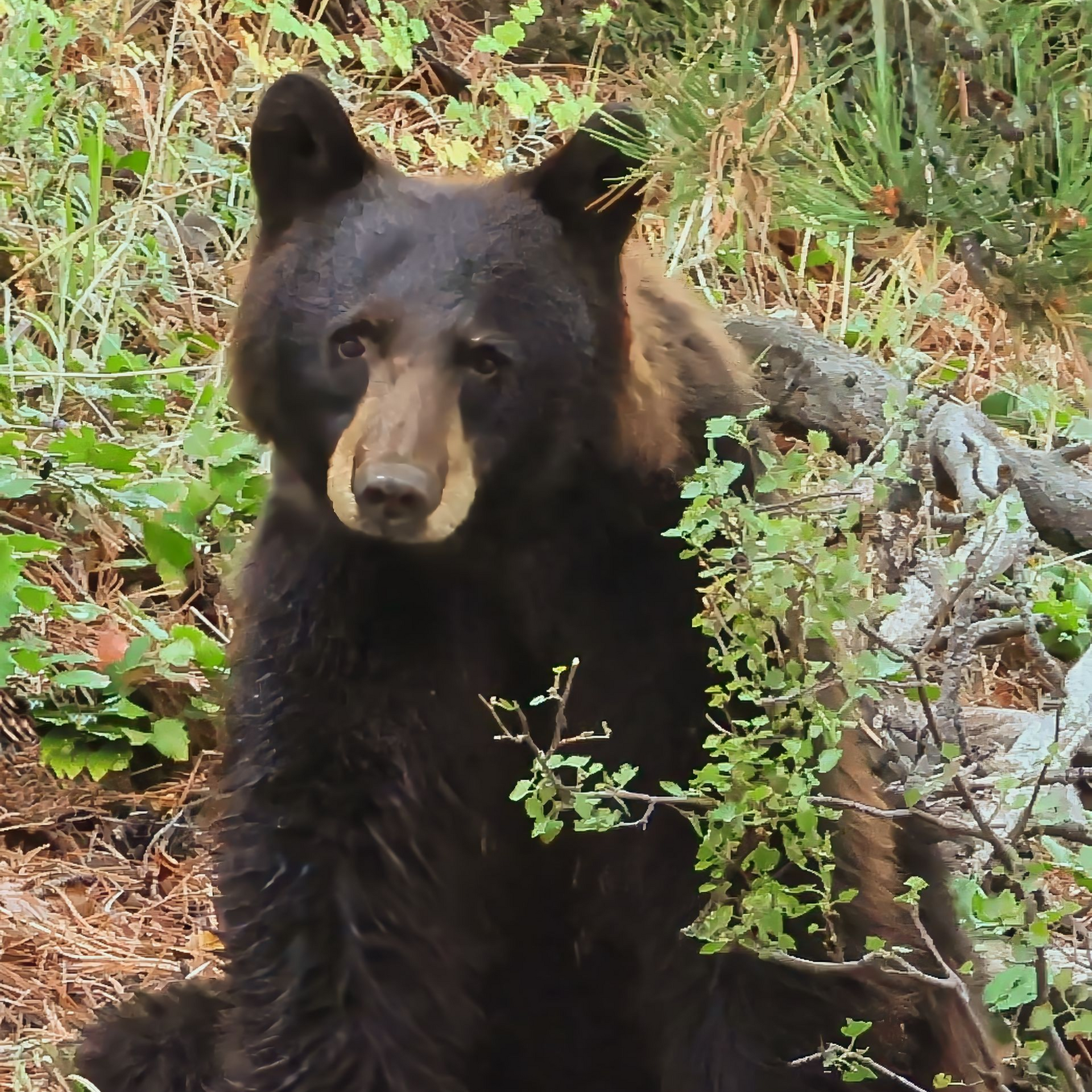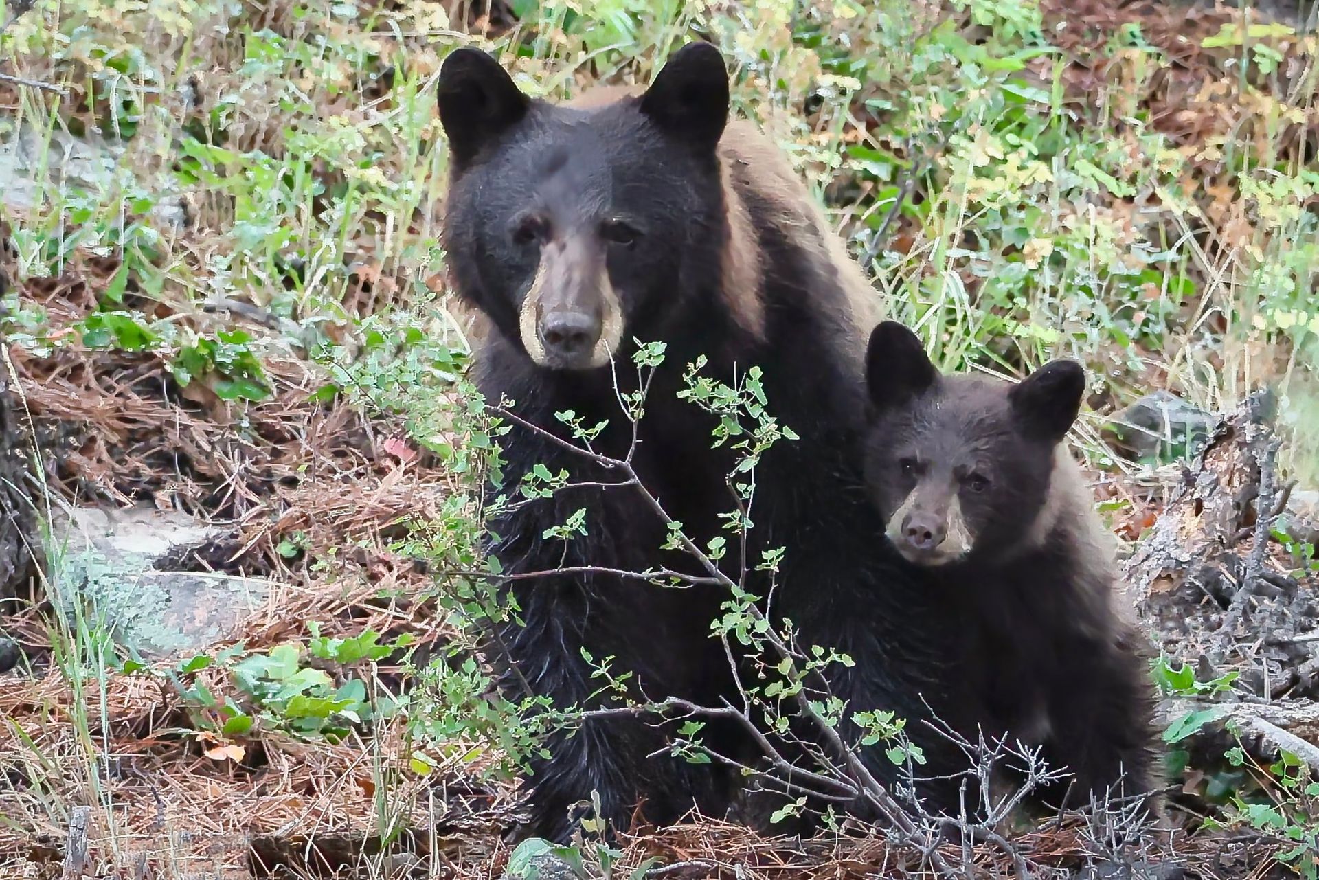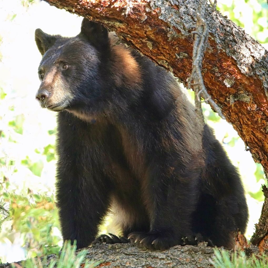 I scanned the area, almost jumping when I saw them. High in a giant ponderosa pine, two cubs slept peacefully on parallel tree branches. Looking back to where I had seen the mother bear, she emerged on the edge of the foliage, moving to the tree. Climbing up, she stopped below the cubs. From there, she stood, reaching her paws over a branch, and stared at me as if to say, “No closer.” Respectfully, I obliged.
