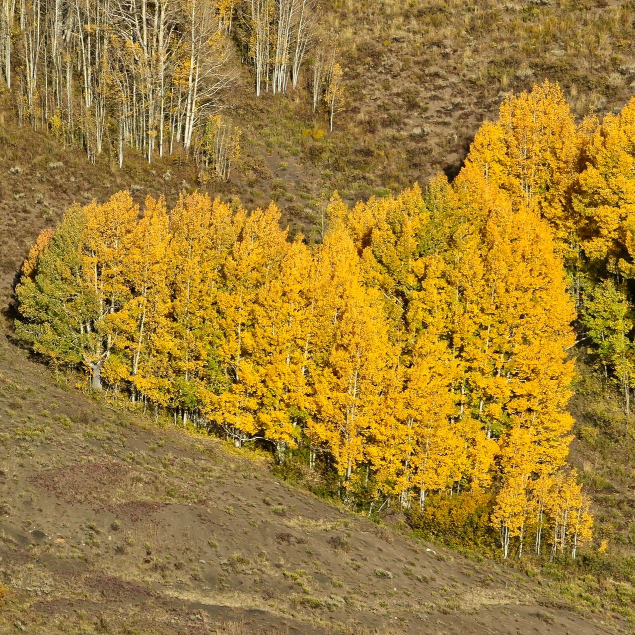 The mountainside was layers of yellow and green interspersed with the tall white trunks of the aspen. As the dense aspen forest prevails, the lower branches on the trees do not receive enough sunlight. Thus, as they grow the lower branches fall from the tree, creating tall, narrow slats of thick white crowned with the colors of fall.