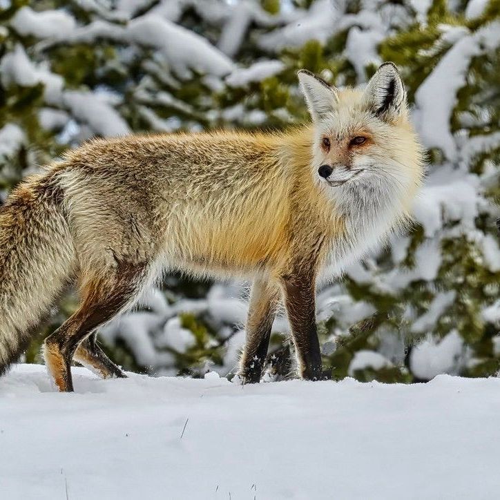 Seeing he was moving west toward a stand of young pines, I guided my friends easily and quietly down the road. By the time he had disappeared into the trees, we were standing in front of them. There, we did not move. We waited. Eventually, we saw him peeking out from not far away. His yellowish-red was bright against the white snow among the green pines.