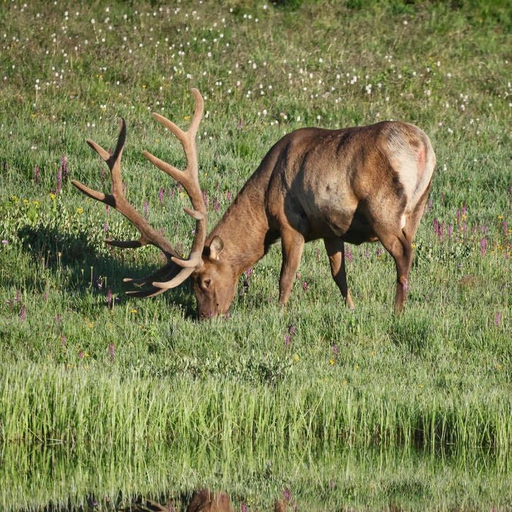 By July, the treeless peaks have turned green attracting groups of bull elk, their antlers growing an inch a day. Cow elk have brought their calves to the mountain top to feed in the cooler elevations, and when weather warms, they can be found lying on the patches of snow for air conditioned relief.
