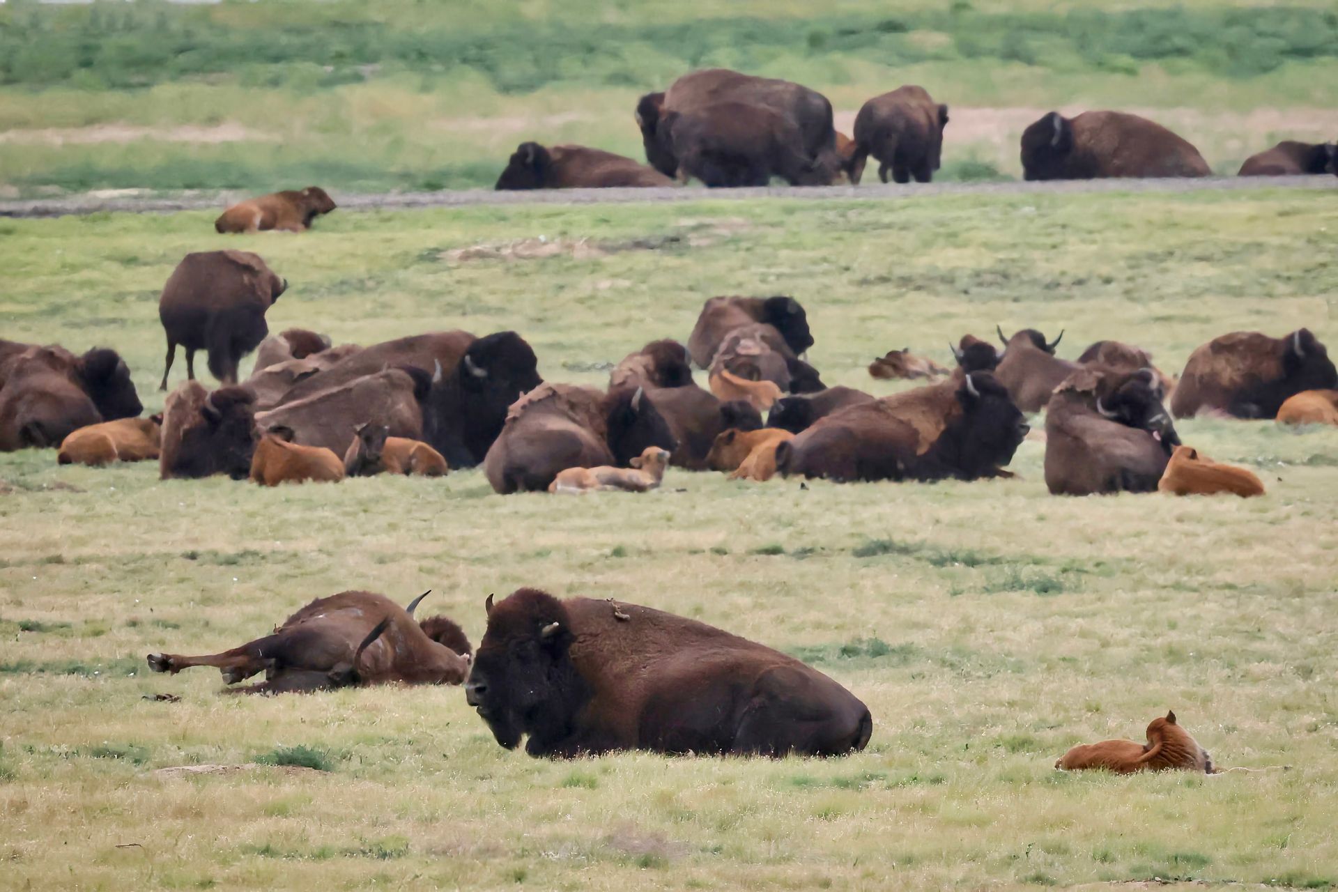 Further down the loop, a herd of a hundred or so bison were scattering in rest on the meadow. Among the dark adults were the red dogs, month old calves sleeping by their mothers. Nicknamed for their reddish-brown coat, in another two months they would grow and transition into the dark, adult brown coat. Watching the herd, older and more dominant bulls wandered solitarily in the distance, a natural consequence of their social structure and competitive nature.